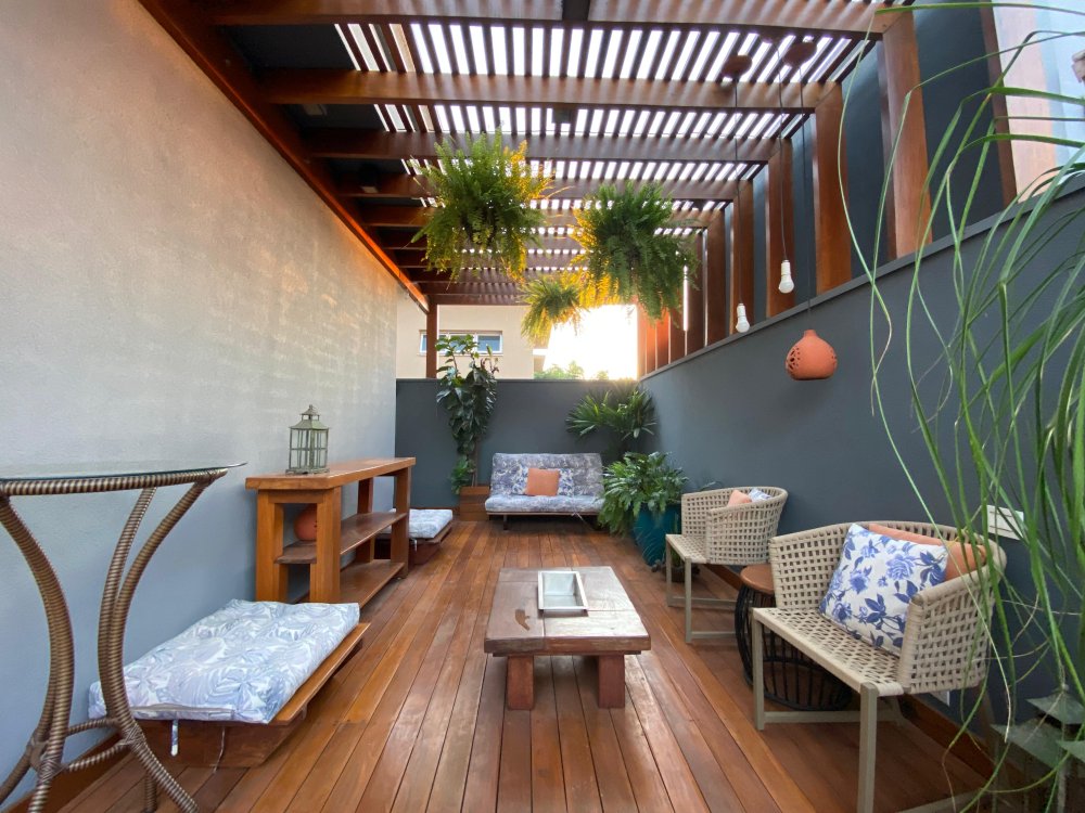 A área externa, com uma piscina com tratamento sal e aquecida, sauna integrada e vestiário para maior comodidade.