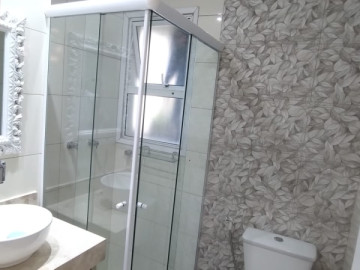 Banheiros com acabamento em mármore travertino, box de vidro, espelhos e gabinete