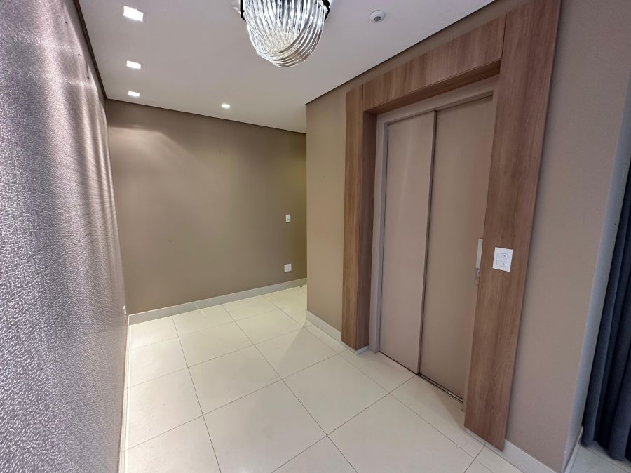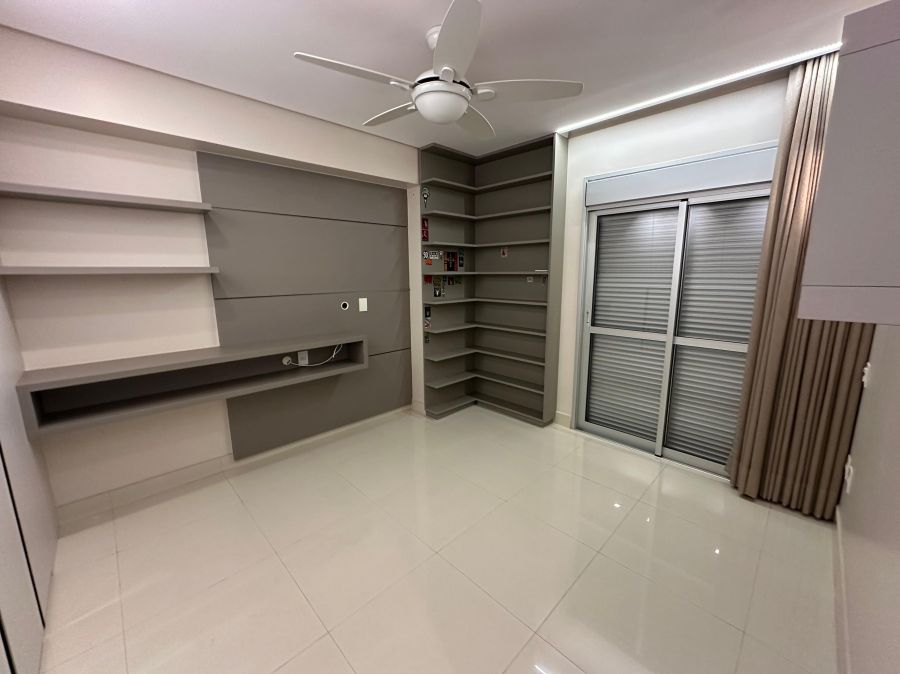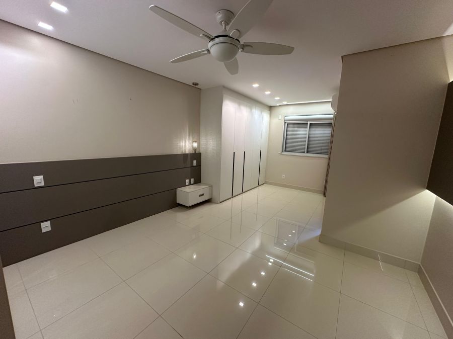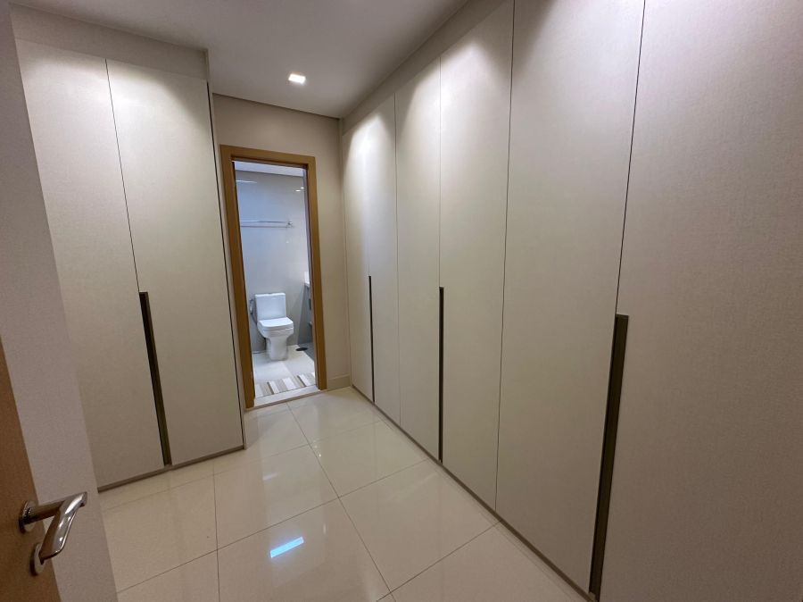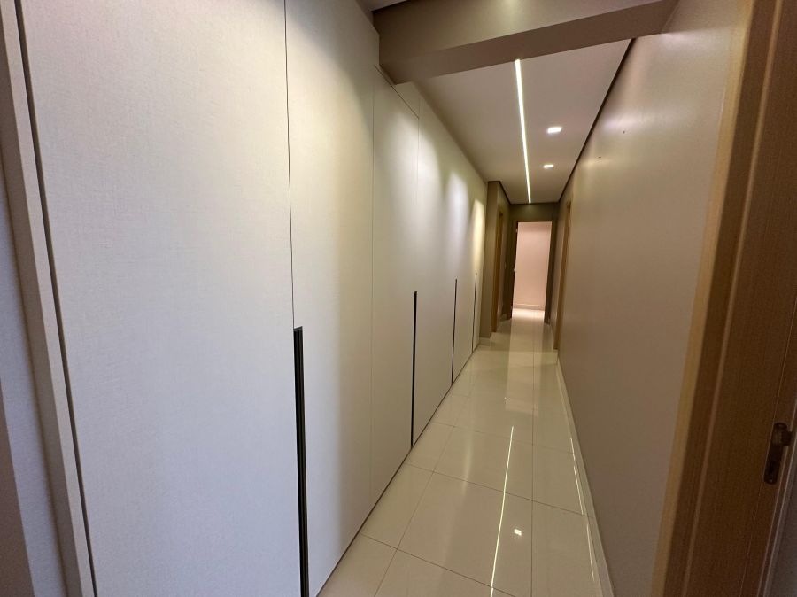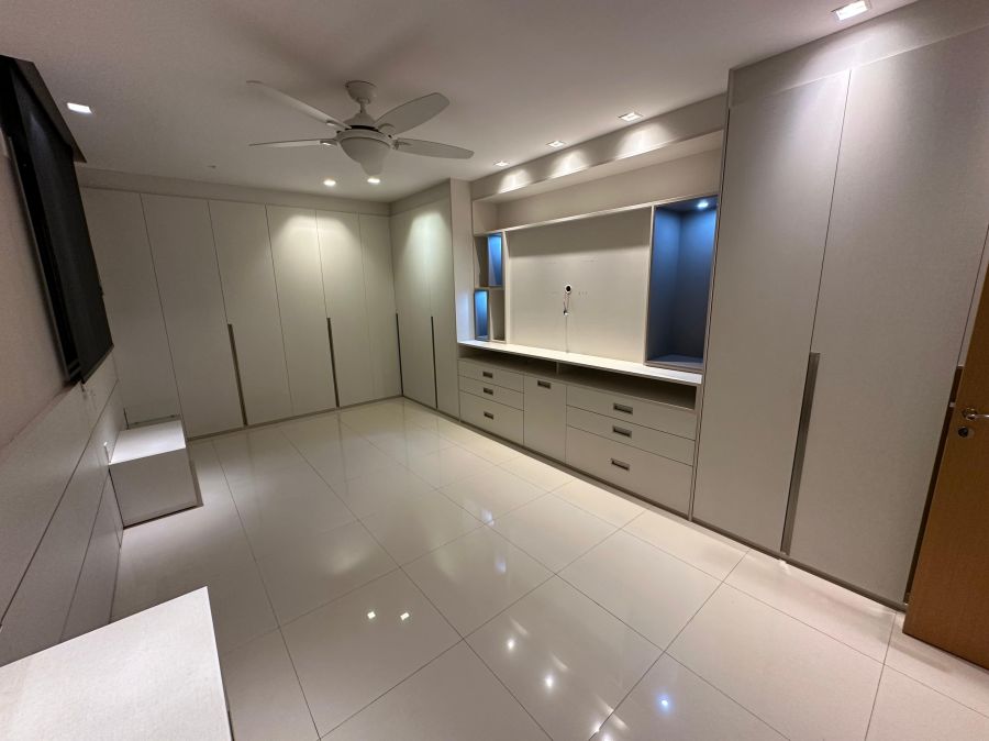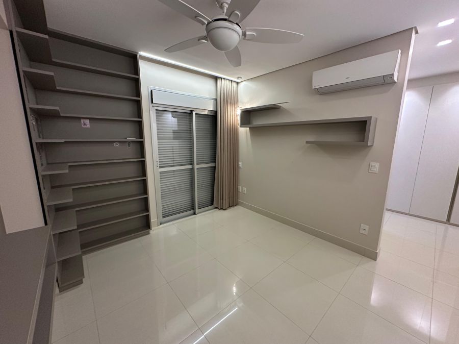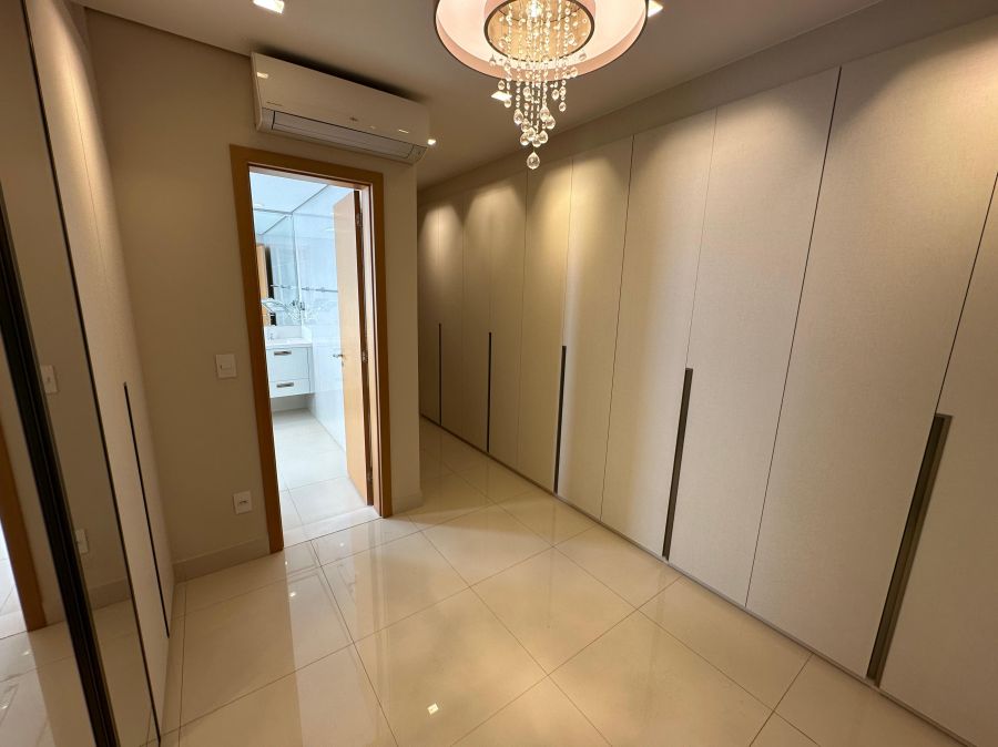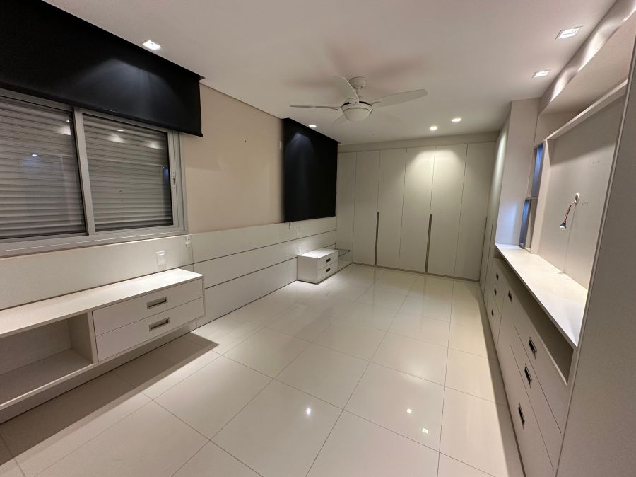 Ambientes climatizados com ar-condicionado, armários planejados e projeto de iluminação sofisticado.