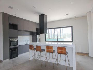 - Cozinha com ilha moderna: completa com cooktop, geladeira, torre quente e lava-louças, combinando funcionalidade e design