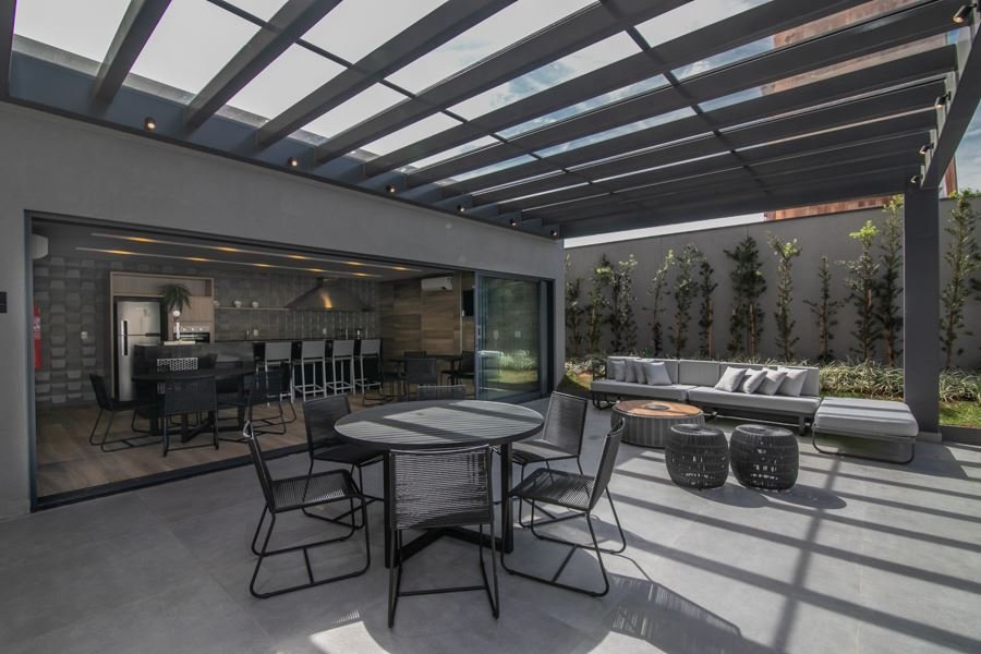Varanda gourmet nivelada com a sala, totalmente fechada em vidro