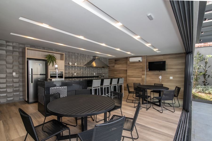 Sala espaçosa integrada à cozinha e à varanda gourmet
