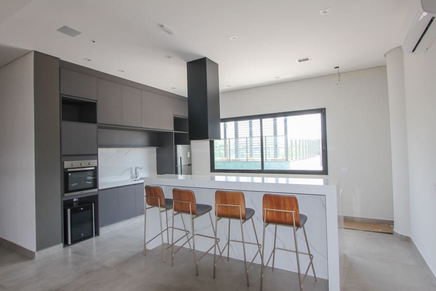 - Cozinha com ilha moderna: completa com cooktop, geladeira, torre quente e lava-louças, combinando funcionalidade e design